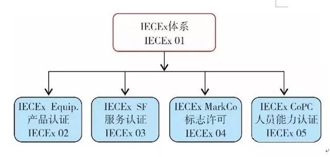 IECEx認(rèn)證系統(tǒng)包括IECEx02產(chǎn)品認(rèn)證,IECEx03服務(wù)認(rèn)證,IECEx04標(biāo)志許可,IECEx05人員能力認(rèn)證見(jiàn)圖1。